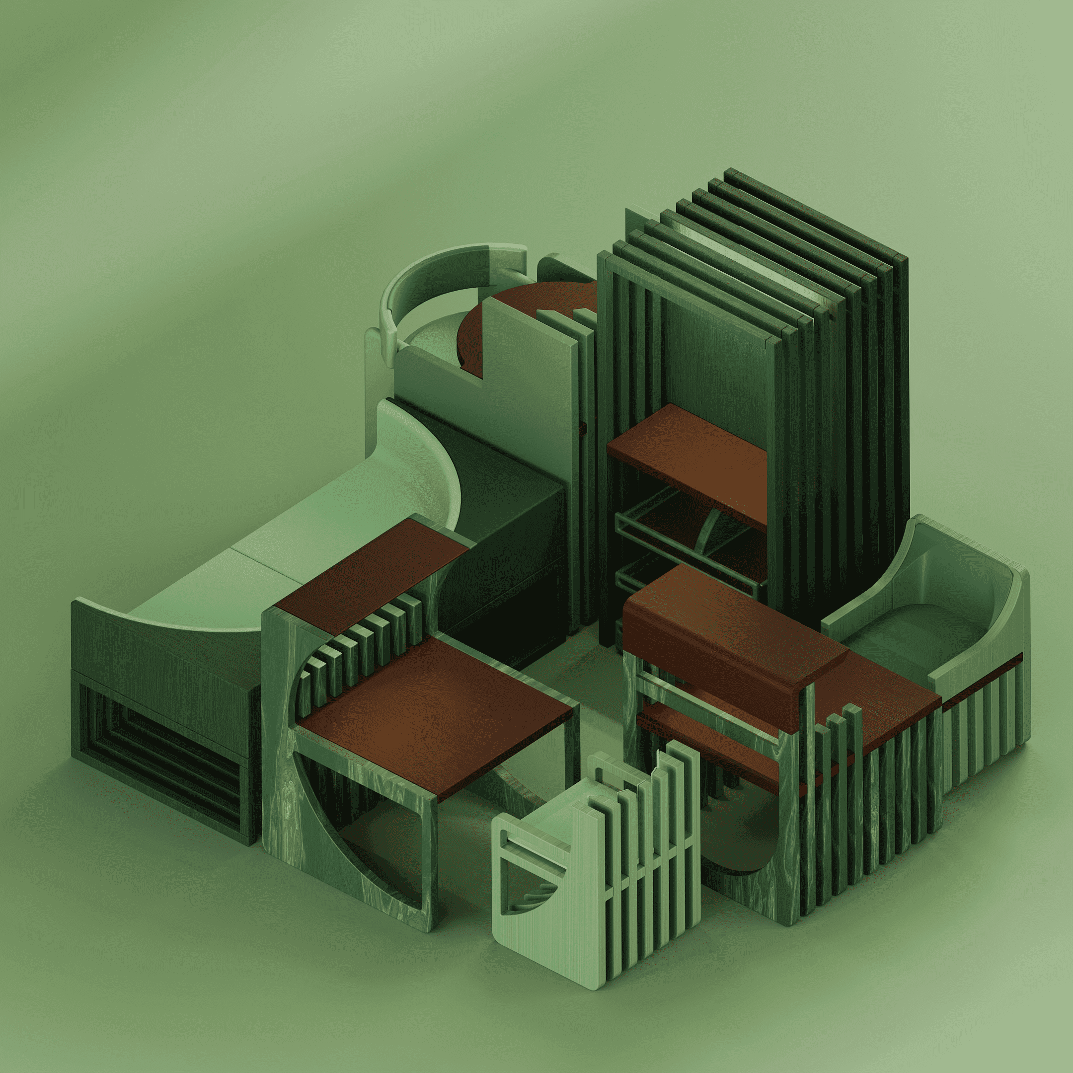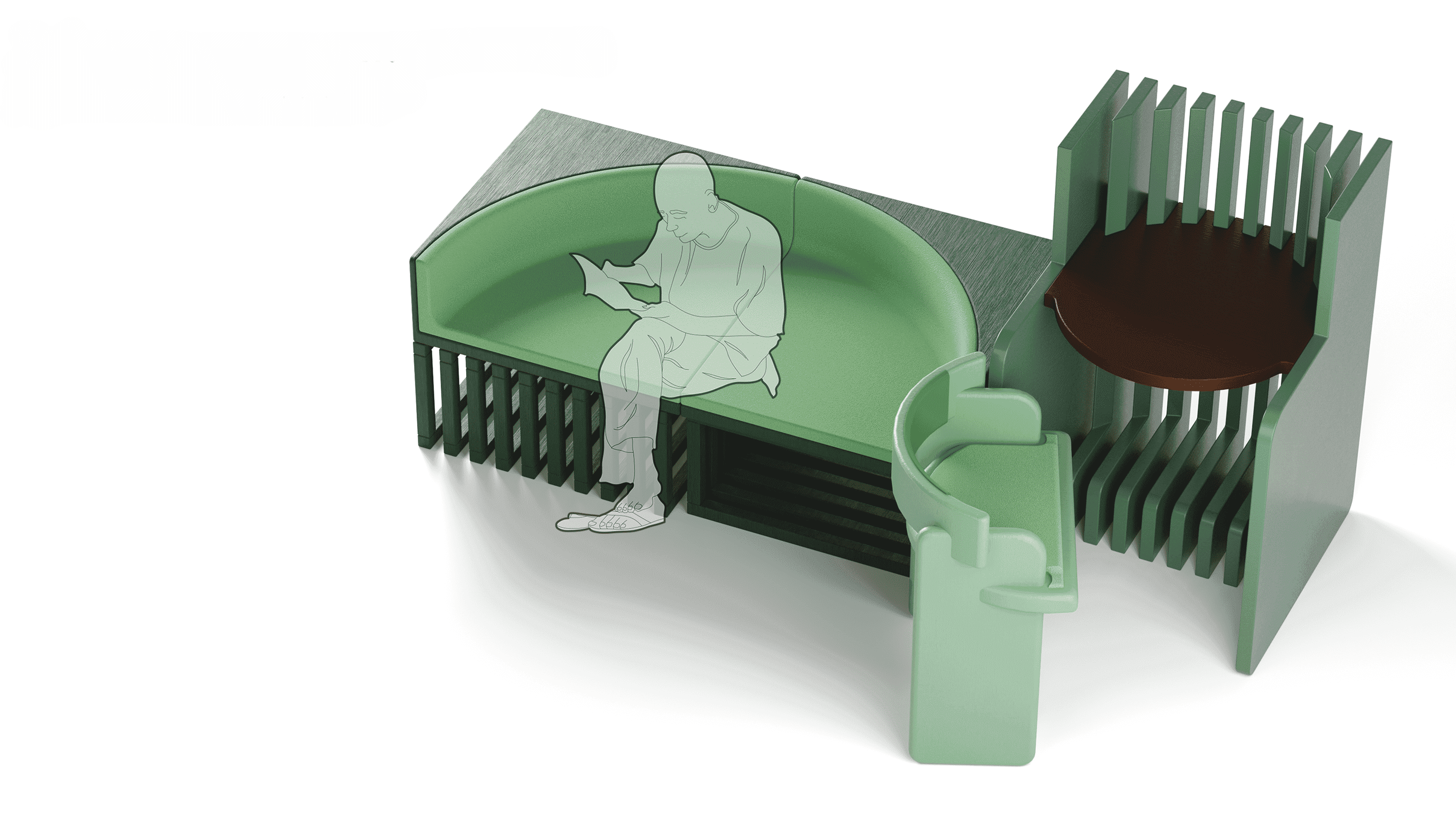 Isometric view of 3D model representing each individual seating unit that can be arranged with a linear space of 3 mts width.
